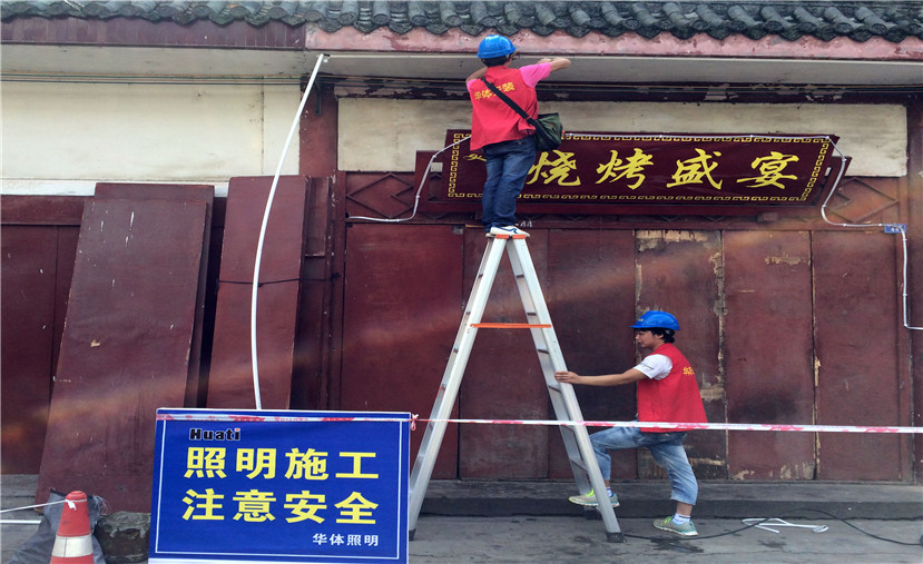 此次安裝工程時間緊、任務重,特別是天氣炎熱的夏天,是黃龍溪古鎮的旅游旺季,人流量特別大,為了不影響景區正常運營,華體照明安裝隊伍選擇早上六點到十點和下午六點到晚上十點兩個時間段錯峰施工。