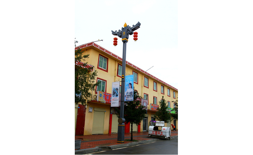 安裝在S209線的“犇牛”燈以高山高寒地區(qū)特有的珍稀牦牛為設(shè)計元素,牦牛被藏族人民稱為“高原之舟”。設(shè)計者通過燈型主體將牛頭牛角外部輪廓展現(xiàn)出來,塑造了一個栩栩如生、富有力量感和氣勢磅礴的犇牛形象。燈桿中部燈箱絲印臧八寶圖案,內(nèi)置LED光源,愿當(dāng)?shù)孛癖娂槌T冢鞂俸湍溃笕缭浮?