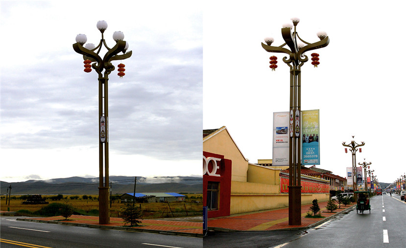 安裝在霞穹街、絳熙街的“佛手”燈以藏傳佛教紋飾為主要設(shè)計元素,燈桿主體以藏紅色搭配藏金色,色彩在藍(lán)天白云下更顯莊重與典雅,底座陽刻象征吉祥如意的藏式紋飾,展現(xiàn)出紅原獨特的地域風(fēng)情與人文特色。