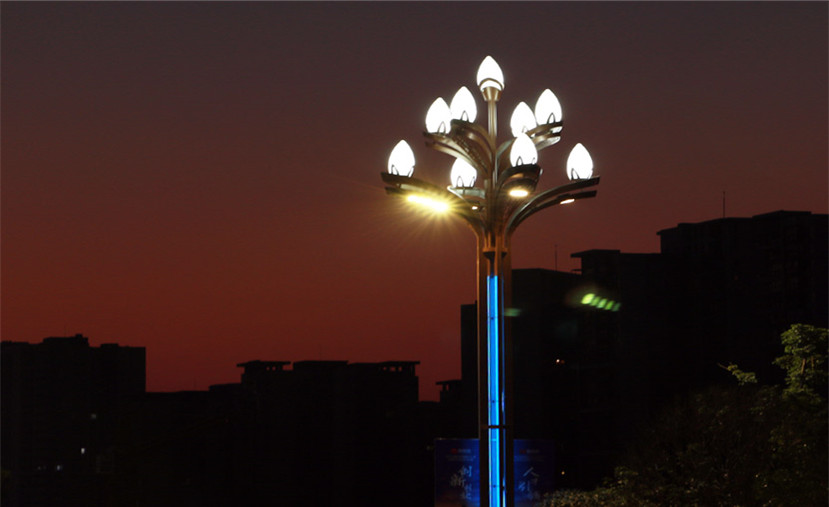 為提升玉蘭燈的景觀作用,本次為業主方提供的玉蘭燈還在燈桿中部設計有可以七彩變色的LED燈帶,讓本身就具有景觀照明作用的玉蘭燈在夜間顯得更加美觀和靚麗。