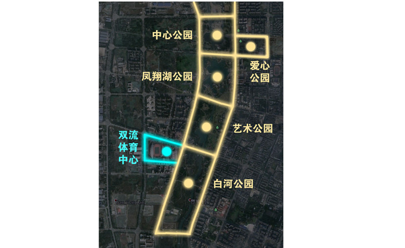 如果將金河路、銀河路兩面擁抱的五個(gè)公園比作串在一起的項(xiàng)鏈,那么雙流體育中心則像是鑲嵌在這串項(xiàng)鏈上一顆璀璨的珍珠。