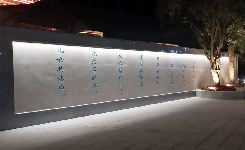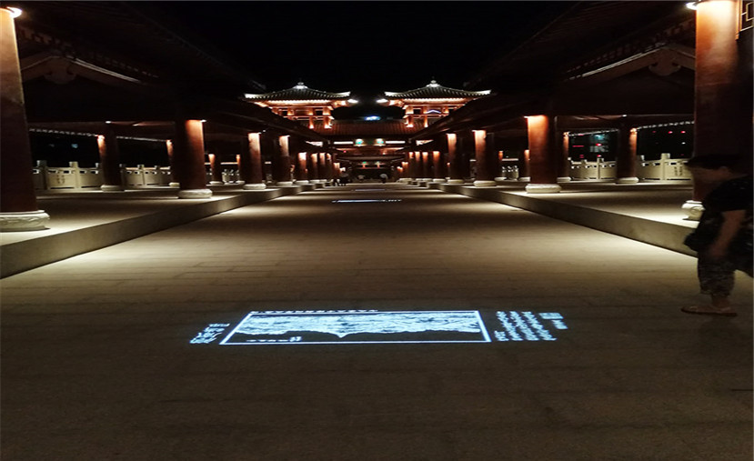 在景觀亭頂部照明及風雨廊頂部照明的光環(huán)境下,華體結合地面原有文化浮雕,采用燈光投影的方式,將新津十二景的一筆一劃投射到地面,通過一橋,看遍新津十二景。