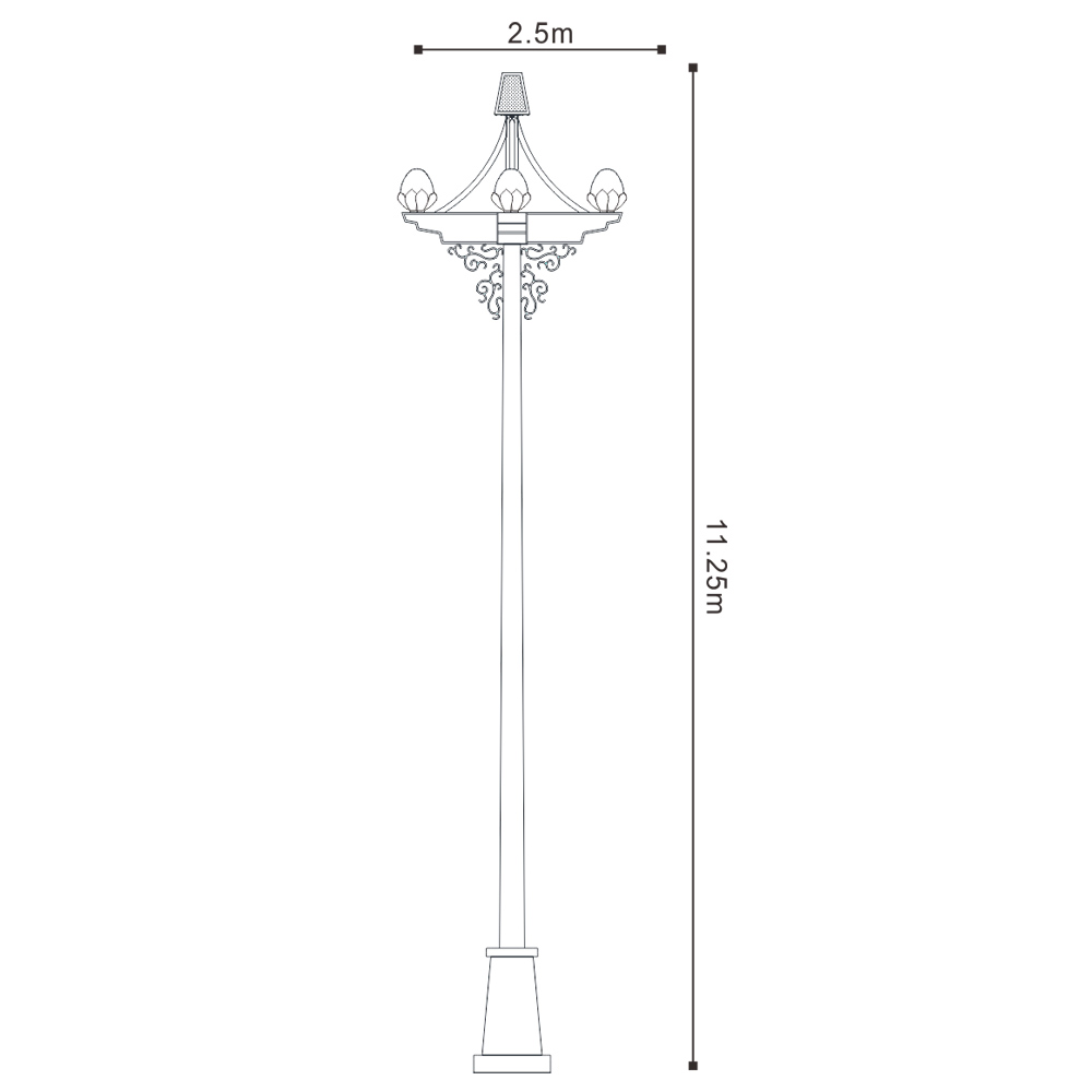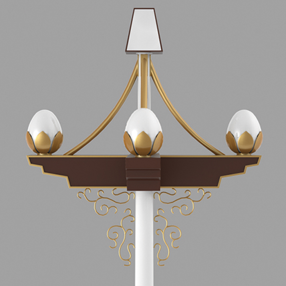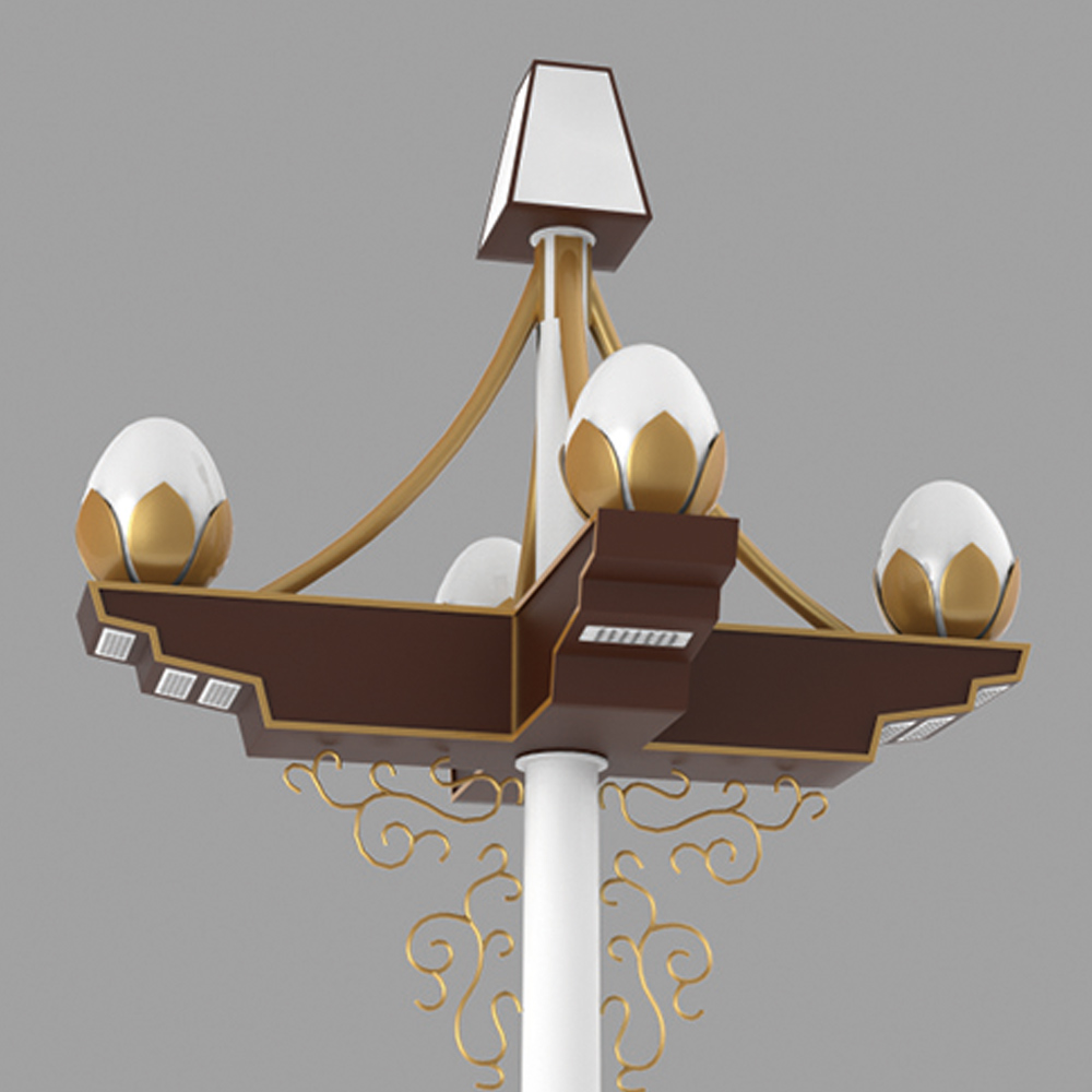 燈罩形似金蓮象征西藏的佛教文化,燈臂象征廟宇,結構整體充滿了西藏獨有的風格,造型突出、結構鮮明、簡潔美觀。