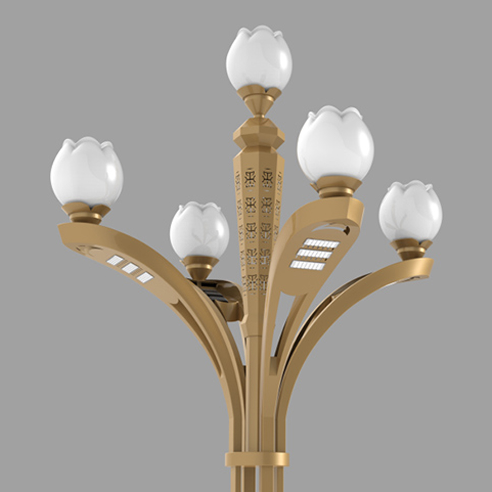 中華燈是一款極具中國特色,外觀大方的多等頭燈具。芙蓉中華燈是在傳統中華燈的基礎上進行了改良,保留其神韻,切加入新的元素,巧妙的運用花瓣的形式,實現了燈桿與燈頭的實體連接;