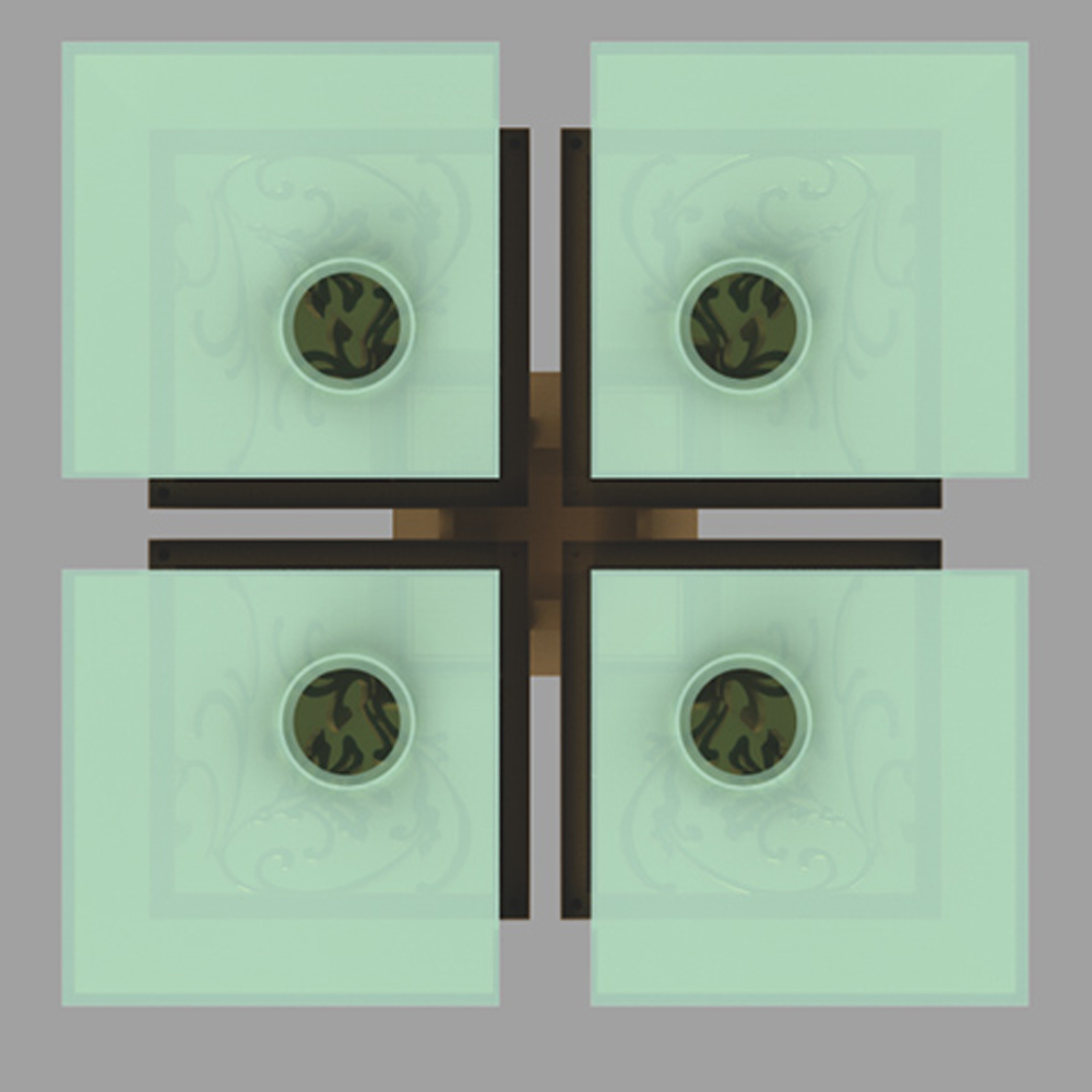 玻璃做成的抽象糧斗造型,搭配傳統鐵花,形成可裝載其他異域文化元素的鏤空花紋,如魚網、臉譜、花草。西昌城市安裝了魚網的鏤空花紋,蘊含了此地獨特的漁家文化。成都的臉譜鏤空花紋造型,宣傳了博大精深的川劇文化;